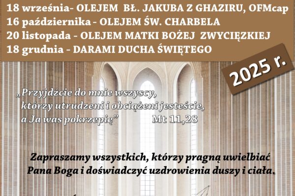 SPOTKANIE ODNOWY W DUCHU ŚWIĘTYM SANDOMIERZ – 21 WRZESNIA 2024 PLAN SPOTKANIA: do godz. 10.00 – rejestracja uczestników spotkania w Domu Katolickim 10.00 – 11.00 – Eucharystia w Katedrze pod przewodnictwem Biskupa Ordynariusza 11.00 – 11.30 – przerwa i przejście do Domu Katolickiego 11.30 – 12.00 – zawiązanie wspólnoty...